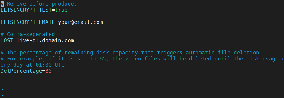 cp .env_sample .env && vim .envLETSENCRYPT_TEST: 此為設定申請測試 SSL 證書,現在給 true,最後上線前才改 falseLETSENCRYPT_EMAIL: Let's Encrypt 在證書到期時通知你用的 email,不會透過這個做驗證。建議正確填入。HOST: WebUI 網址DelPercentage: 超過時要執行刪除功能的磁碟使用百分比
